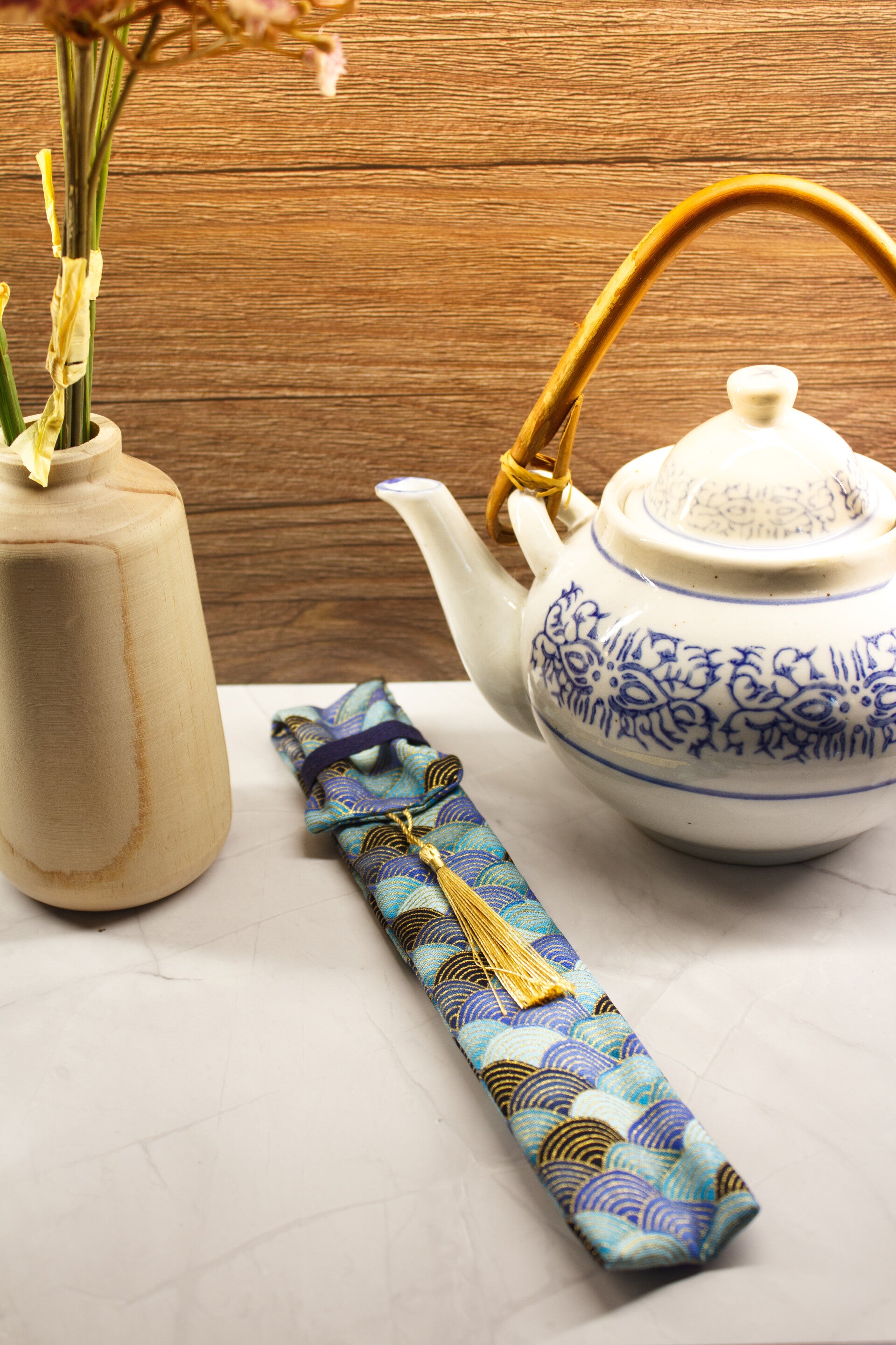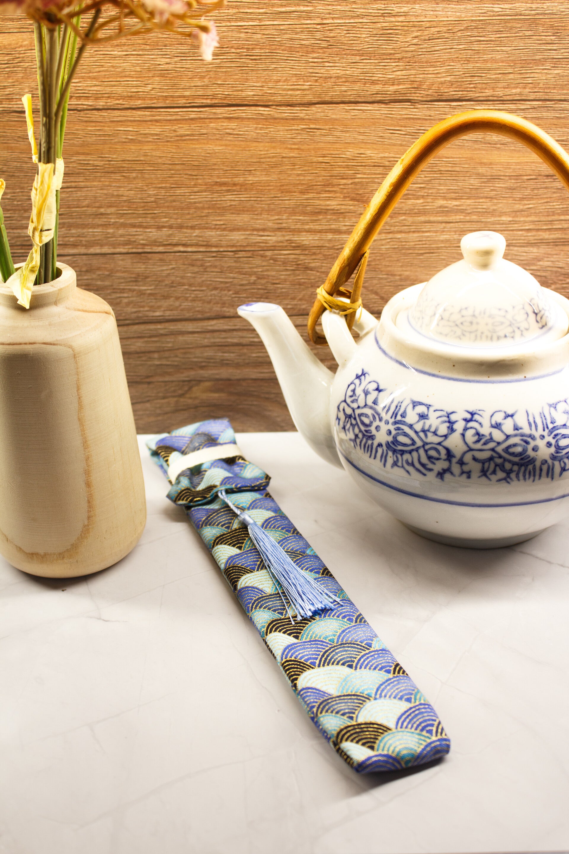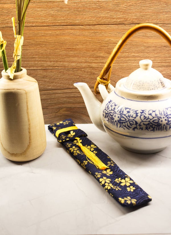 Joli étui refermable au motif d'inspiration "Japonaise" avec une paire de baguette réutilisable en 100% Bambou naturel. Lavage à la main recommandé.